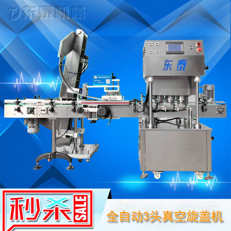該直線式真空旋蓋機(jī)是東泰機(jī)械結(jié)合用戶使用的情況,摒棄了傳統(tǒng)轉(zhuǎn)盤式真空旋蓋機(jī)的弊端,研制開發(fā)的新型高效設(shè)備,設(shè)備自動檢測到兩個瓶子蓋子進(jìn)入到雙頭真空旋蓋機(jī)內(nèi),旋蓋機(jī)彩色顯示屏?xí)?shí)時顯現(xiàn)旋蓋狀況,整機(jī)多點(diǎn)檢測,當(dāng)進(jìn)口無瓶無蓋、出口堵塞、定位不準(zhǔn)、瓶身傾倒均自動停機(jī)。單個旋蓋頭達(dá)到的真空度都可以單顯示,單調(diào)整