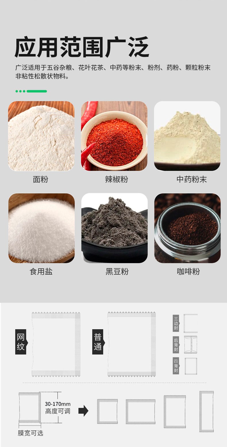 粉劑包裝機比較適用于豆奶粉、辣椒粉、奶粉、咖啡面粉、面粉等物品的計量包裝。與此同時還可以包裝淀粉、奶粉、食用鹽、中藥粉末、調(diào)味品、黑豆粉、預混料、飼料、酶制劑等。粉劑包裝機包裝材料:BOPP薄膜、紙/聚乙烯、玻璃紙/聚乙烯、聚酯/鍍鋁/聚乙烯、聚酯/聚乙烯、茶葉濾紙等可熱封復合包裝材料。