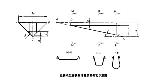 象鼻成型器的制造一般采用不銹鋼薄板,要求外表面光滑乎整。其三角部分和圓弧槽部分可用整塊板料卷曲而成,因為它們的展開寬度是相等的。下圖所示是象鼻成型器結構及展開圖,沿虛線卷折即可制得成型器,圖中參數(shù)可通過計算加以選擇。