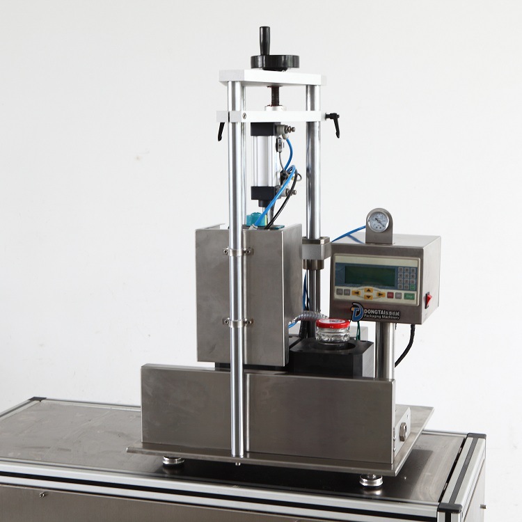 先從個詞半自動來講,半自動指的就是手動與機(jī)器相結(jié)合的操作流程:半自動玻璃瓶真空封口機(jī)是采用了人工上瓶,人工出瓶,機(jī)動旋蓋與抽真空的方式來完成流程。由于人工上瓶,并且該半自動玻璃瓶真空旋蓋機(jī)有無瓶不上蓋,無瓶不抽真空的特點(diǎn),所以大大減少了對瓶蓋與瓶身的損害。并且人工與機(jī)器的配合絲毫不浪費(fèi)時間,比純手工的生產(chǎn)效率要幾倍,還更節(jié)省人力,一臺機(jī)器只需一個人便可輕松完成。